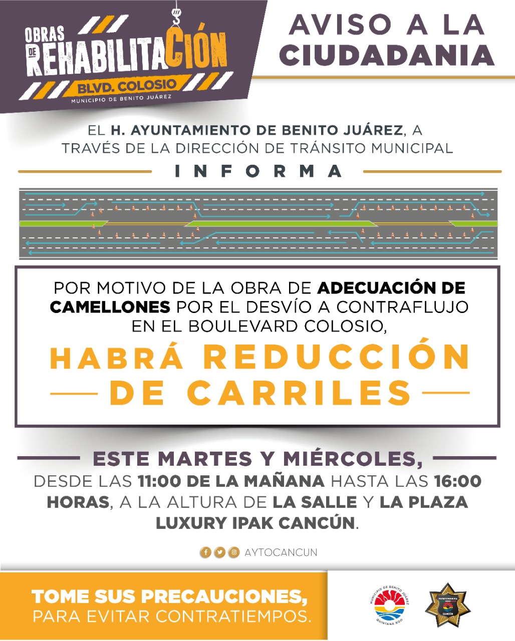 by admin - Jul 26, 2022Cancún, Q.R., a 25 de julio de 2022.- El Ayuntamiento de Benito Juárez y la Secretaria de Infraestructura, Comunicaciones y Transportes (SICT), informan a los ciudadanos que por motivo de la Obra de Adecuación de Camellones... -