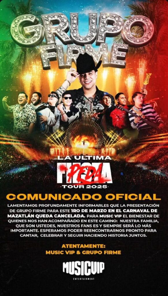 A través de un comunicado oficial compartido en su cuenta de Instagram, Grupo Firme informó a sus seguidores sobre la cancelación de su participación en el Carnaval de Mazatlán 2025, el próximo 1 de marzo.